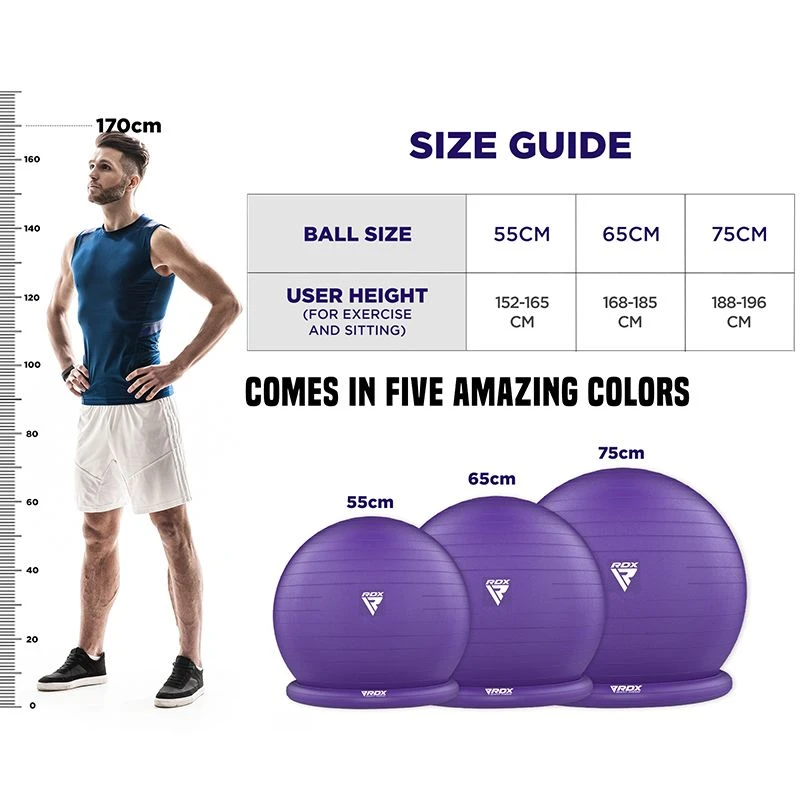 - PICK THE RIGHT BALL ACCORDING TO YOUR HEIGHT – Made for all fitness levels and accommodates all heights with availability in 3 sizes – 55cm (900g) for 150-168cm height, 65cm (1100g) for 168-180cm height and 75cm (1300g) for 180-190cm height. Pick from 5 exciting colours including red, blue, grey, pink and purple to complete your home gym kit.