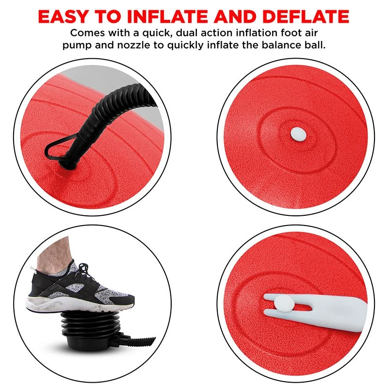 - WITH RESISTANCE BANDS, EASY TO INFLATE – Yoga ball base set with quick inflation Foot Pump, 2 Air Stopper and 1 Stopper Remover can be quickly setup in home gym. Includes attachable resistance tubes pair that can be used to simultaneously work the upper and lower body.